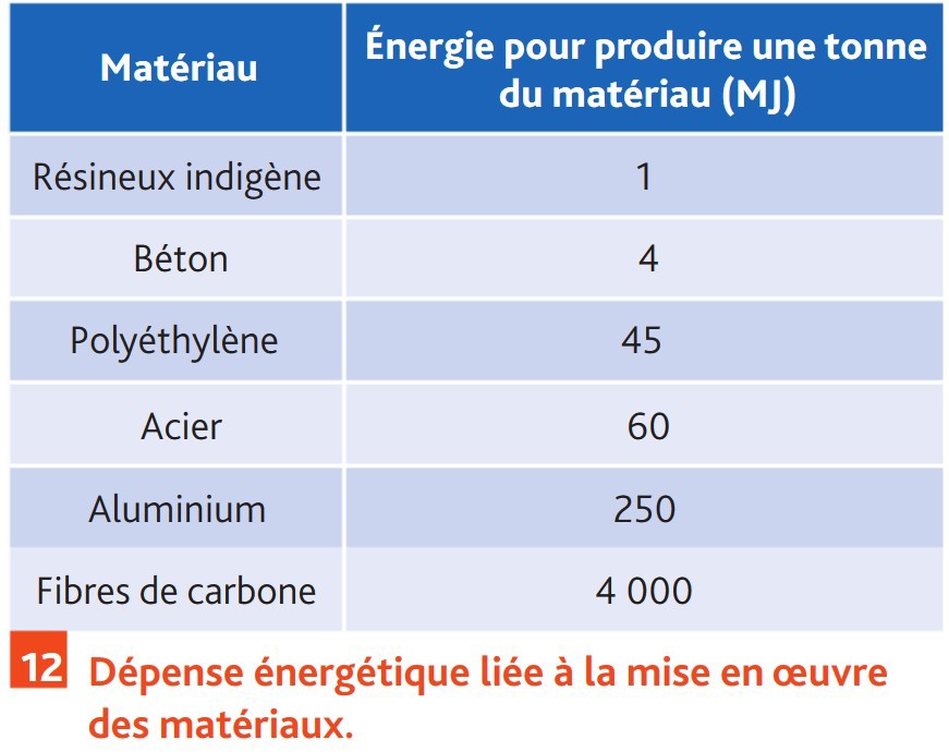 Pour cela, il s'appuie sur des tableaux de données de l'effet environnemental et de la dépense énergétique des matériaux de construction d'usage courant [documents 11 et 12].