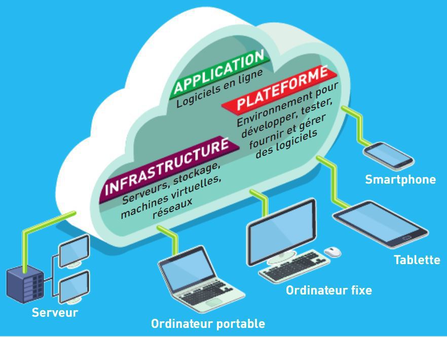Le cloud permet l'accès en ligne à des applications, un espace de stockage et d'autres ressources. Ainsi, les données, au lieu d'être stockées sur des disques durs, clefs USB ou cartes mémoires, sont accessibles par Internet. Il est également possible d'utiliser des logiciels collaboratifs à distance.