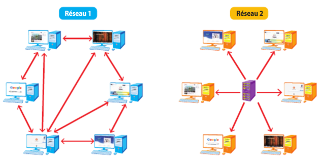 le réseau 2 n'est pas pair-à-pair. : seule la machine centrale répond aux requêtes envoyées par les machines clients autour d'elle.