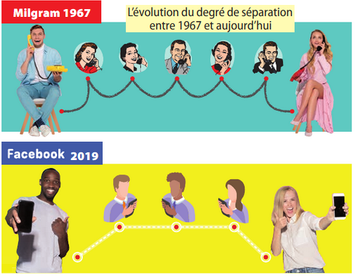 Sur les réseaux sociaux, cette distance s'est raccourcie car il est plus facile de nouer des liens. Ainsi, sur Facebook, 4 personnes en moyenne sépareraient deux abonnés choisis au hasard.